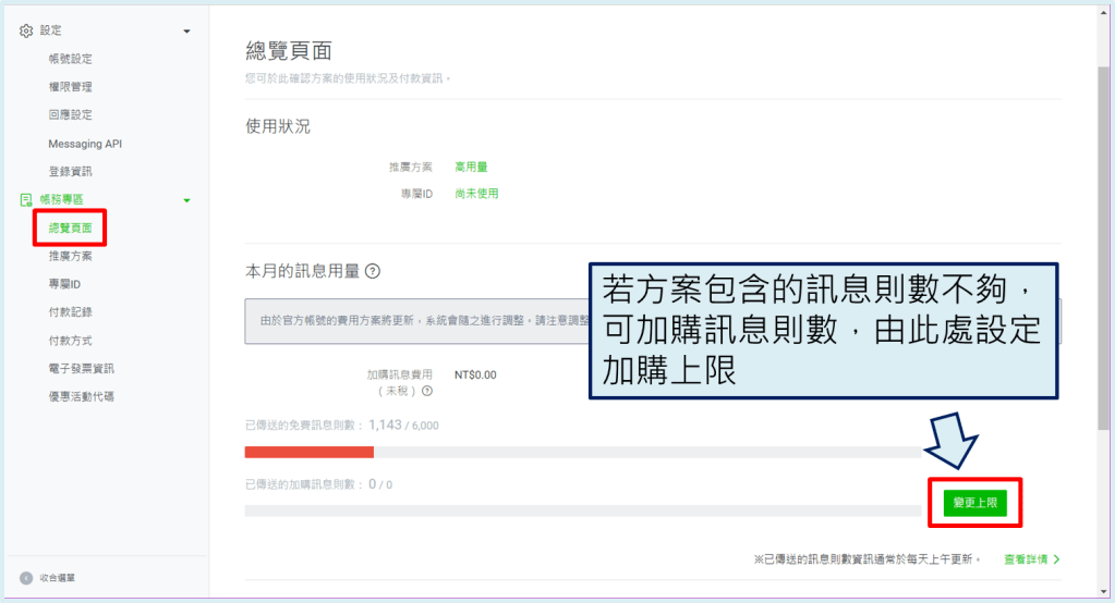 點選頁面右上方的『設定』,再進到左邊欄位『帳務專區』→『總覽頁面』,即可於總覽頁面中查看目前使用方案以及本月已發送的訊息則數