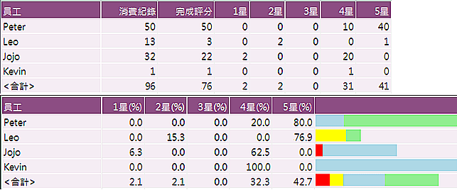 透過 i-so POS 系統,除了能夠查看顧客評分的星等、回饋的意見外,也能夠更進一步將紀錄做統計分析,查看每位人員 1~5顆星分別的評分數量與佔比,相信對服務者來說,評分成績持續進步的過程,雖然辛苦,但是快樂且滿足的!