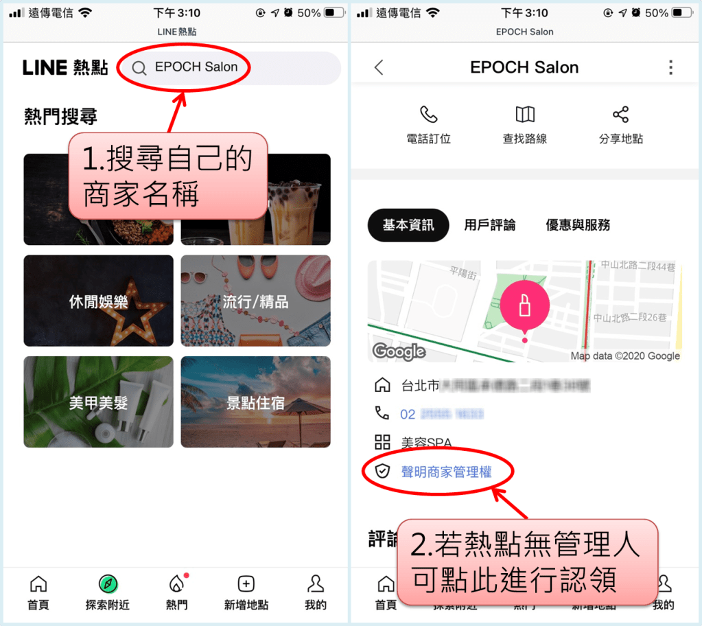 尚未有管理人的熱點,在基本資訊處會顯示『聲明商家管理權』,接著依畫面指示填寫聯絡人資料即可送出申請,待審核通過即完成認領!