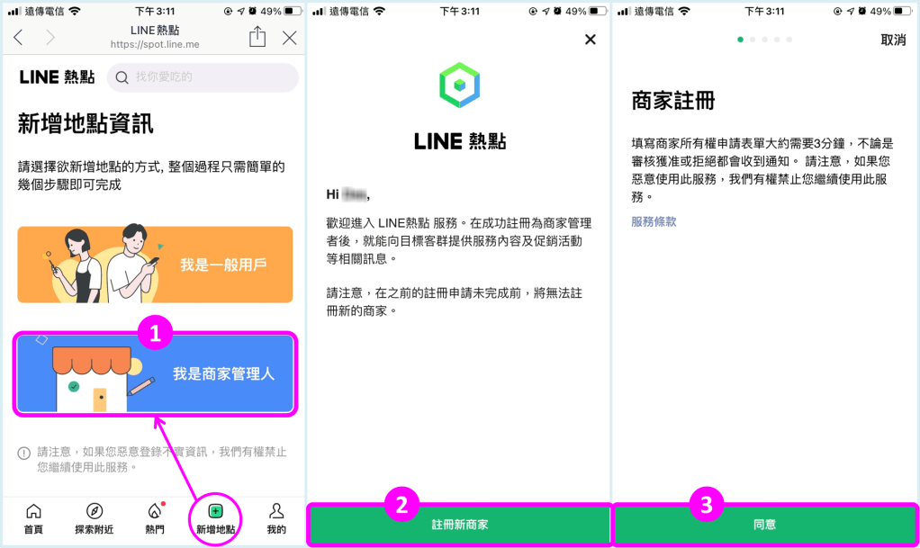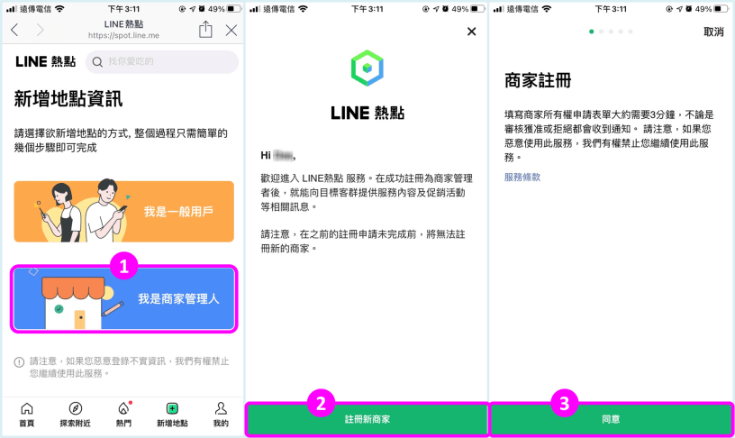 若資料庫中沒有您的商家資訊,可自行申請,請透過手機操作,到LINE熱點首頁選擇『+新增地點』後,依照下述步驟開始註冊; 或直接 >> 點我註冊 進入第 ② 步驟