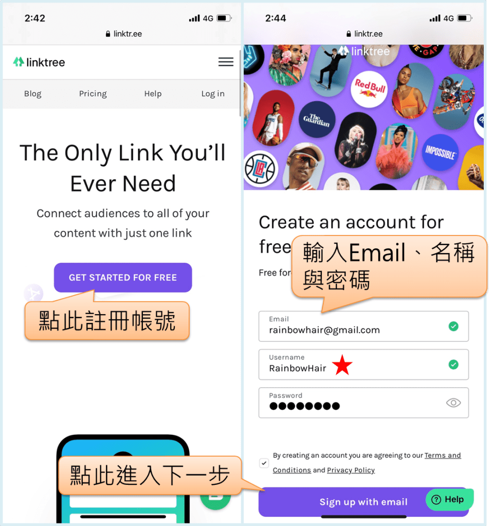 首先需要先註冊一個帳號,點選「註冊Linktree」,選擇 GET STARTED FOR FREE 後依序輸入