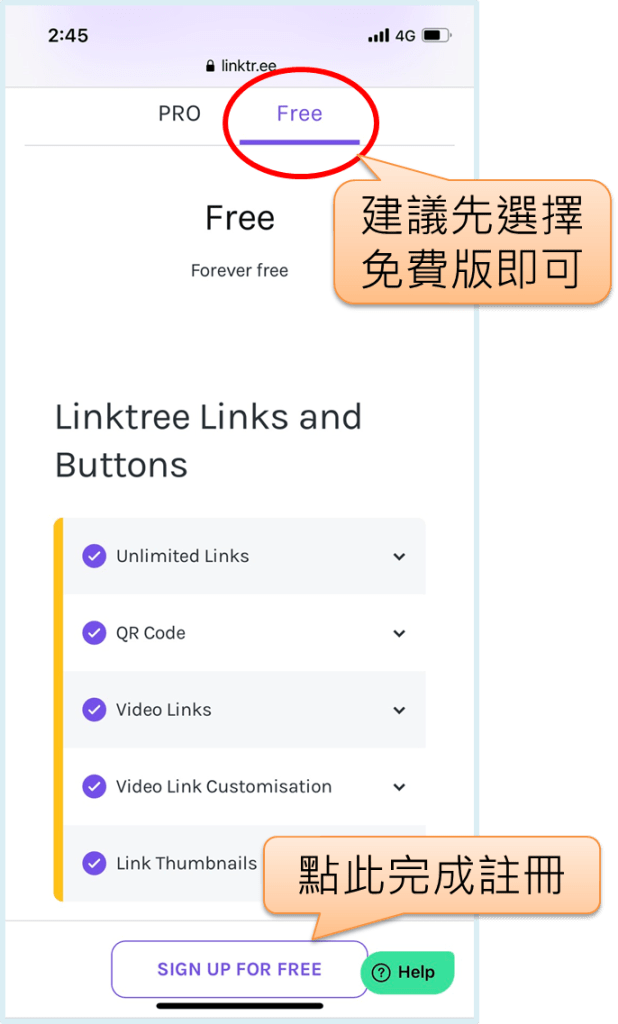 Linktree提供付費的PRO版本及免費版,建議可以先選擇免費版即享有基本功能使用,未來若有需求再評估是否改為付費版,接著點下方的「SIGN UP FOR FREE」即可完成註冊