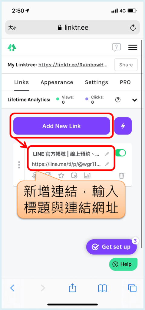註冊完成後,即可開始放上要呈現在頁面中的連結,點「Add New Link」可以新增連結,自行輸入/貼上連結的標題(Title) 與網址(Url)