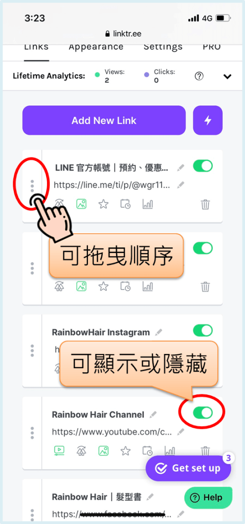 重複上方的步驟,一一設置好要放上的所有連結; 如需調整順序,按住左側「⋮」可上下拖曳; 若有設置好的連結需暫時隱藏,可透過標題列旁的開關來控制