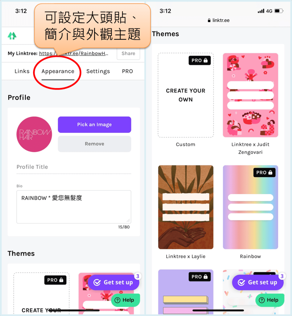 切換到「Appearance」頁面,在上方「Profile」處可上傳大頭貼並輸入簡介; 下方「Themes」則可選擇主題,免費版僅能從預設主題中選擇,如欲選擇有標示PRO的主題,或自行上傳背景,則需要購買付費版本