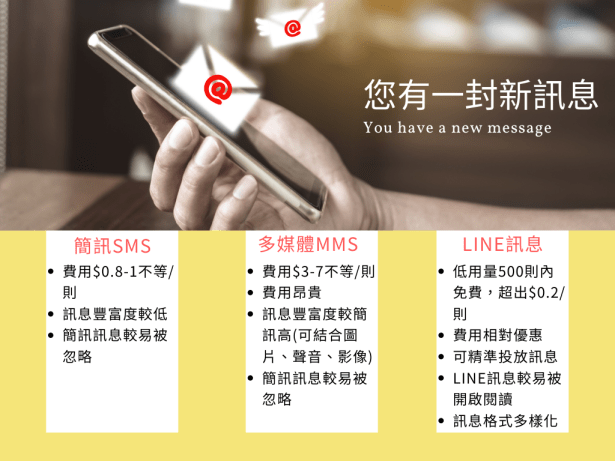 相對地,傳統簡訊SMS的變化度就較低了,僅能傳送單純的文字,甚至會受限於文字的長度,例如當文字70字以內為1則的訊息費用,超過70字以上就會以2則計算…以此類推(依照每家簡訊業者有不同的規定),僅以文字的方式很容易就會被消費者忽略。