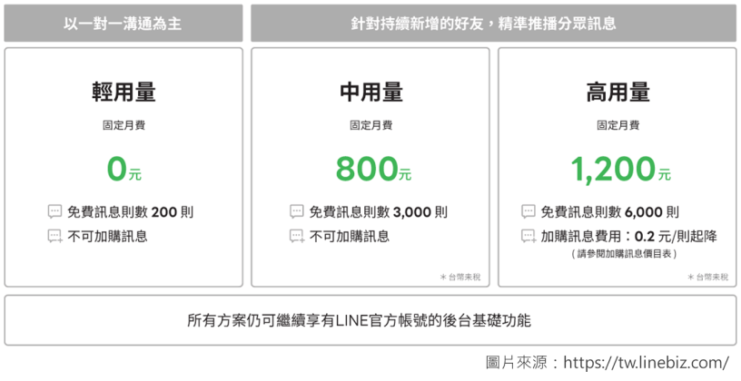 LINE 官方帳號分為「輕用量」、「中用量」、「高用量」三種方案,各方案包含的可用訊息則數分別為 200 則、3,000 則、6,000 則; 若您原本是使用「輕用量」,預估每月需要使用的則數在 3,000 則以內,可升級為「中用量」; 不過需注意,「輕/中用量」使用完則數後不可再另外加購訊息,只有「高用量」能夠加購,因此如預估每月需要使用 3,000 則以上,則建議升級為「高用量」