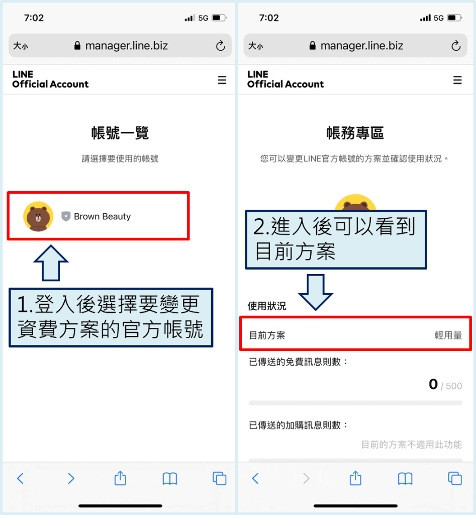 用手機瀏覽器(例如 Safari、Chrome) 開啟帳務專區頁面網址後,登入您的LINE帳號,並並進入目前要變更方案的官方帳號,進入後就可以看到目前使用中的方案
