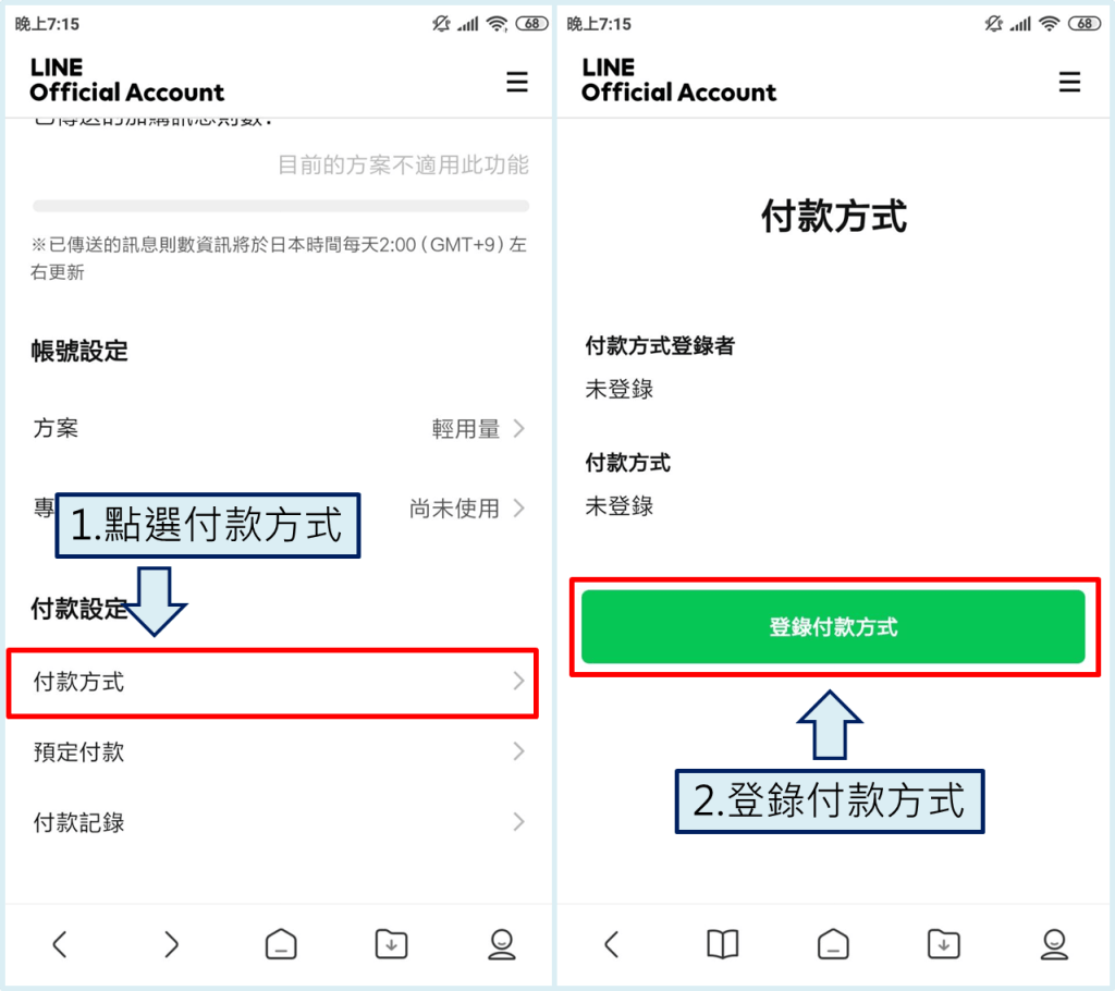 A:LINE官方會依照您登錄的付款方式,方案月費在每個月第一週進行扣款,超發(加購)費用會在次月10日進行扣款