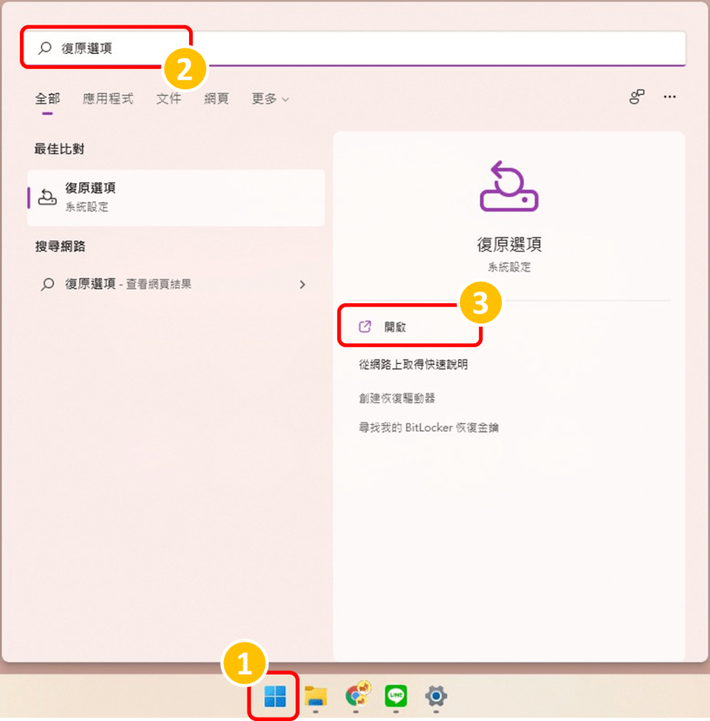 1.在Windows開始畫面的搜尋欄,搜尋「復原選項」並選擇開啟