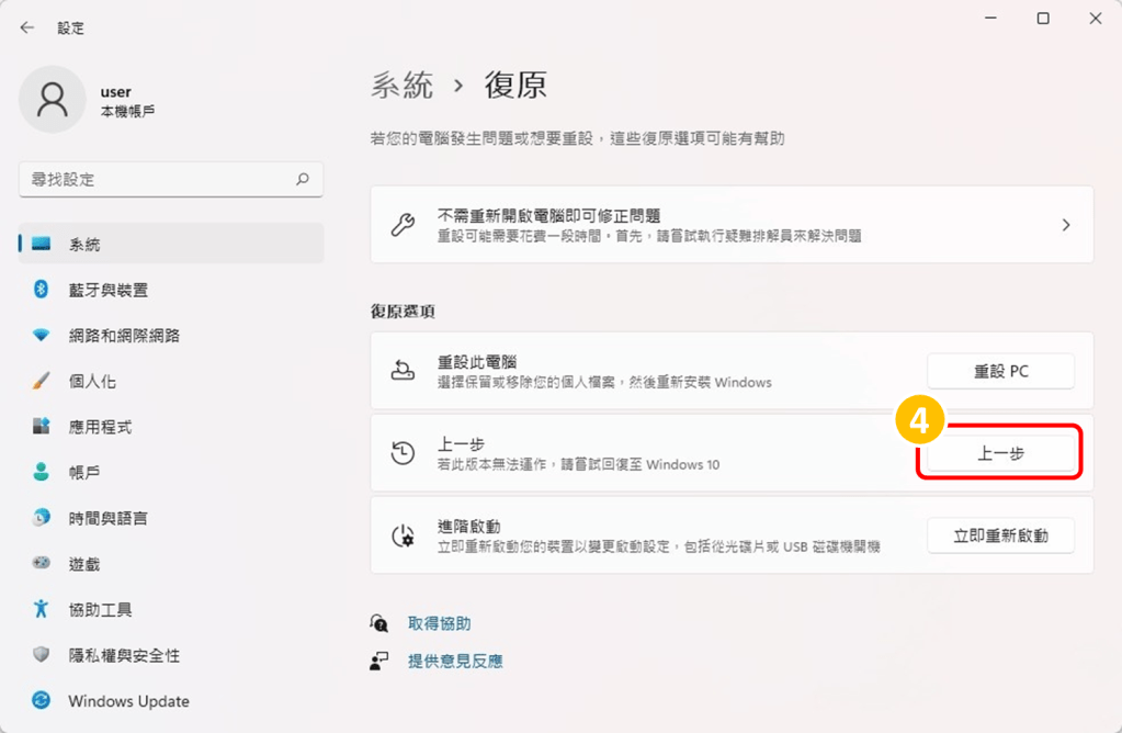 若您在更新至 Windows 11 後,曾經執行過系統重置,或是進行磁碟清理,或者建立了Windows本機帳戶,將無法使用回復功能還原至 Windows 10