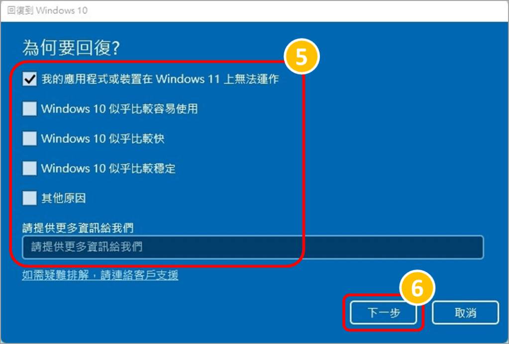 3.選擇一個欲回復Windows 10的原因,接著點選「下一步」