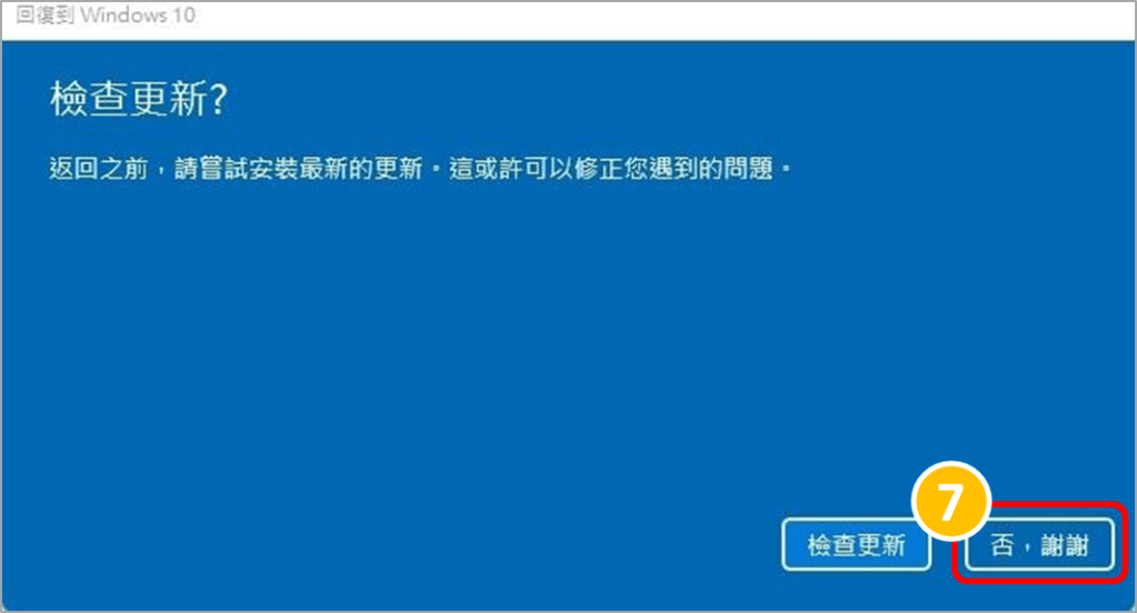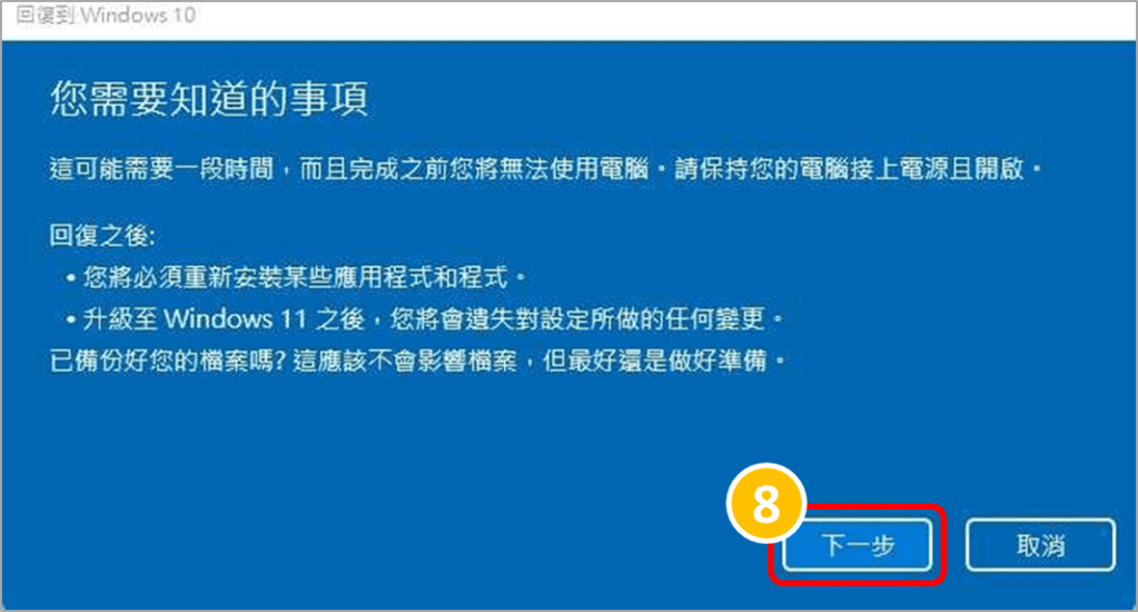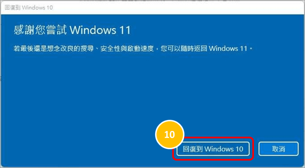 7.點選「回復到 Windows 10」電腦即會開始回復作業系統版本作業,請留意在此過程請不要關閉電腦或是拔除電源,以免回復作業異常