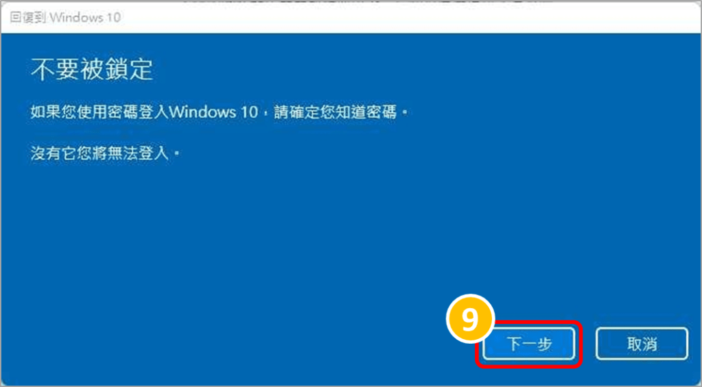 6.如果您在新增後,曾經修改密碼,復原Windows版本後,您會需要使用舊密碼登入,請確認您知道舊密碼,再點選「下一步」