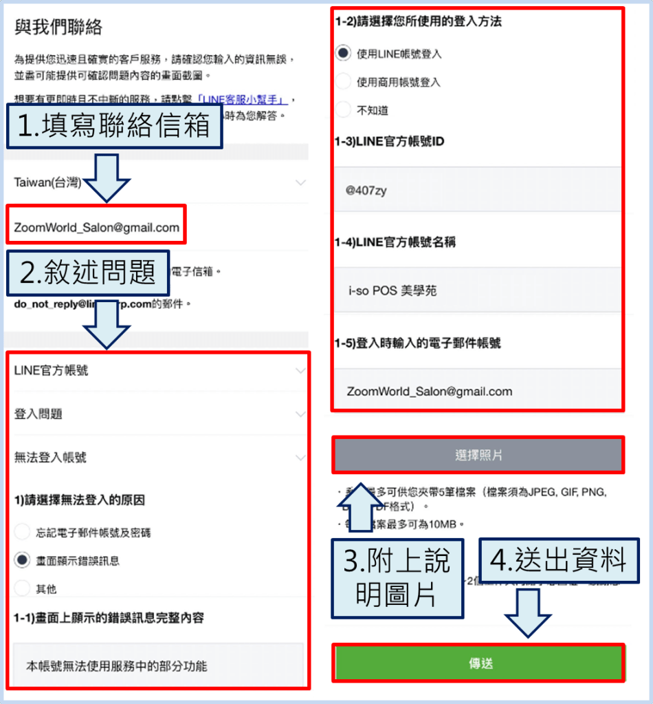 您可以「填寫LINE官方聯絡表單」,必要時搭配圖片說明,向LINE官方反映您的狀況。