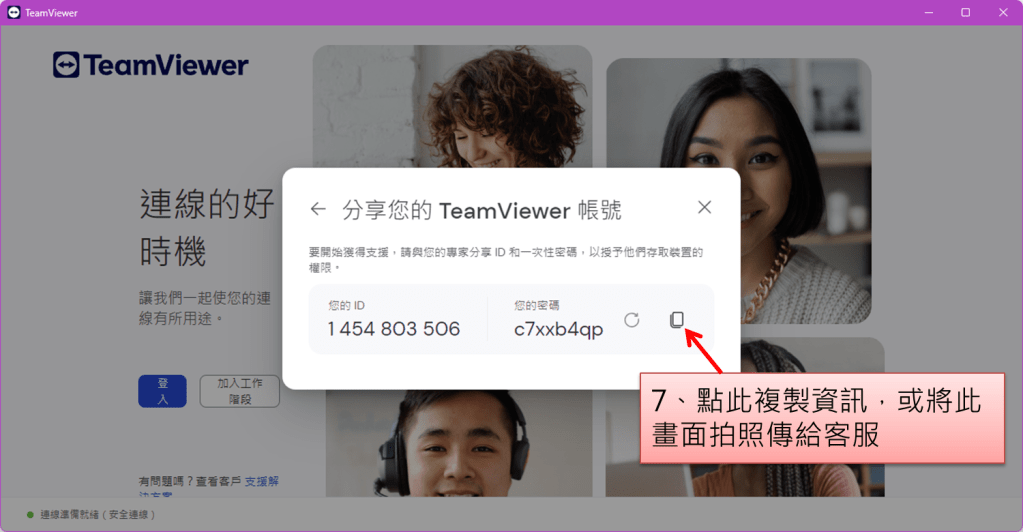 請注意 !!! TeamViewer 每一次開啟,密碼皆會更新,所以每一次需要客服連線支援時,請於開啟後重新將密碼提供給服務人員
