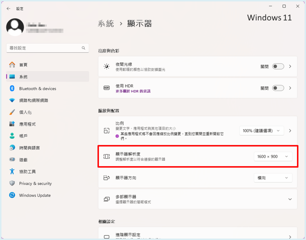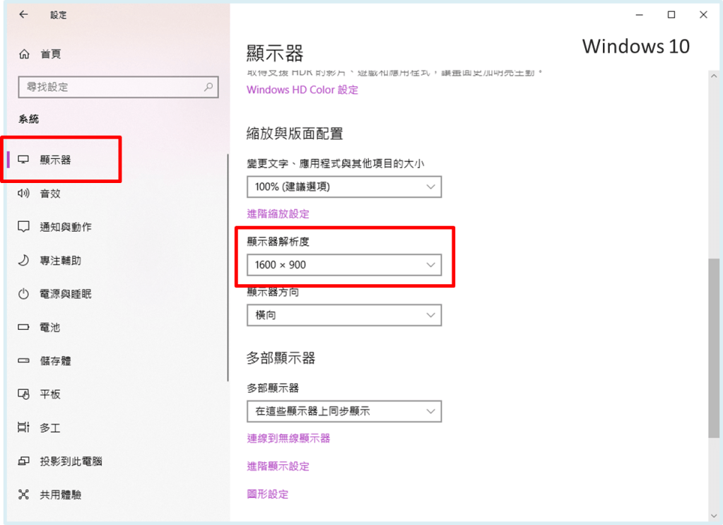 進到電腦的「設定」→「系統」中的「顯示器」,即可看到顯示器解析度