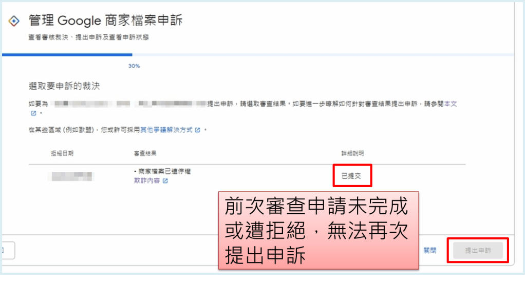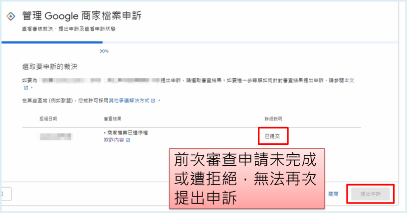 不過有可能碰到送出復權申訴後 尚未被審查,或者申訴遭拒,想要再次提出時,卻無法點選「提出申訴」