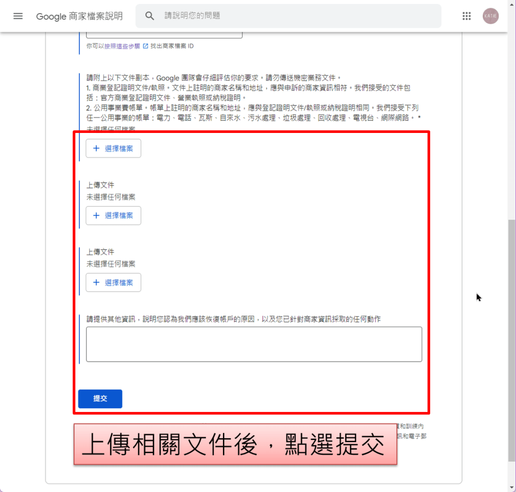 接著分別上傳頁面所要求的文件後,點選「提交」即可,Google 收到申請後,會再 Email 回覆審查結果